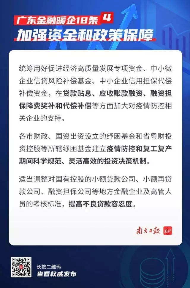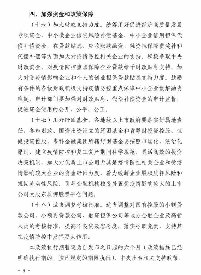 《意見》要求,統(tǒng)籌用好促進經(jīng)濟高質(zhì)量發(fā)展專項資金、中小微企業(yè)信貸風險補償基金、中小企業(yè)信用擔保代償補償資金,在貸款貼息、應(yīng)收賬款融資、融資擔保降費獎補和代償補償?shù)确矫婕哟髮σ咔榉揽叵嚓P(guān)企業(yè)的支持。各市財政、國資出資設(shè)立的紓困基金和省粵財投資控股等所轄紓困基金建立疫情防控和復(fù)工復(fù)產(chǎn)期間科學(xué)規(guī)范、靈活高效的投資決策機制。適當調(diào)整對國有控股的小額貸款公司、小額再貸款公司、融資擔保公司等地方金融企業(yè)及高管人員的考核標準,提高不良貸款容忍度。