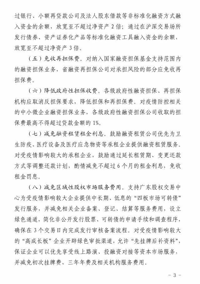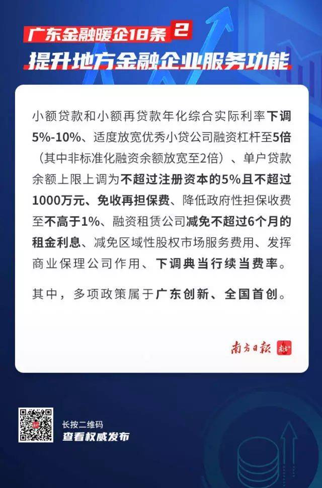 在中央已出臺金融政策基礎(chǔ)上,《意見》出臺多項全國首創(chuàng)政策提升金融企業(yè)服務(wù)功能,具體可以概括為:“三降三免一放寬”。“三降”是降低小額貸款和小額再貸款利率5%—10%,降政策性擔保收費至最高不超過貸款總額的1%,降續(xù)當費率1‰—5‰,“三免”是免再擔保費,免不超過6個月的融資租賃租金利息和租金罰息,免區(qū)域性股權(quán)市場服務(wù)費用;“一放寬”是放寬優(yōu)秀小貸公司杠桿率至凈資產(chǎn)5倍,其中非標準化融資杠桿放寬到2倍。另外,還有延期或展期1—3個月、免除1—3個月罰息等優(yōu)惠。