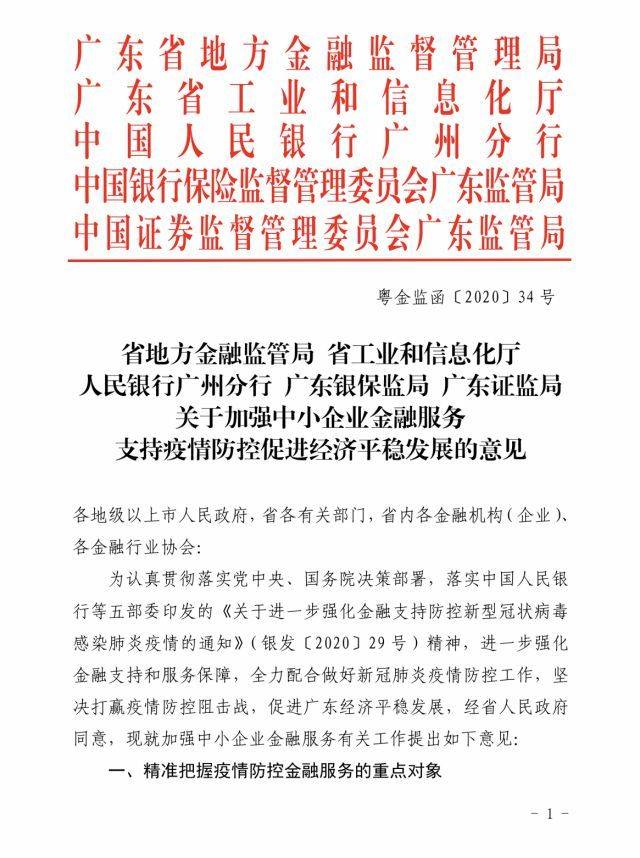 2月13日,省地方金融監(jiān)督管理局、省工業(yè)和信息化廳、人民銀行廣州分行、廣東銀保監(jiān)局、廣東證監(jiān)局經(jīng)省人民政府同意聯(lián)合印發(fā)《關(guān)于加強中小企業(yè)金融服務(wù)支持疫情防控促進經(jīng)濟平穩(wěn)發(fā)展的意見》(下稱《意見》)。這是防疫期間全國首個省級支持中小企業(yè)金融專項文件。