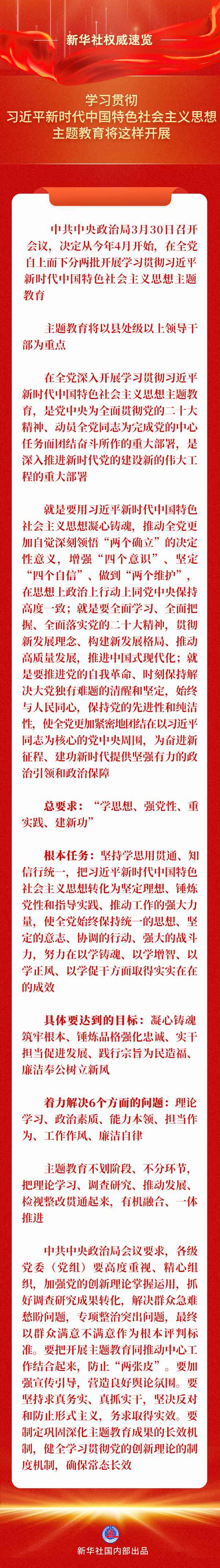 中共中央政治局3月30日召開(kāi)會(huì)議,決定從今年4月開(kāi)始,在全黨自上而下分兩批開(kāi)展學(xué)習(xí)貫徹習(xí)近平新時(shí)代中國(guó)特色社會(huì)主義思想主題教育。
