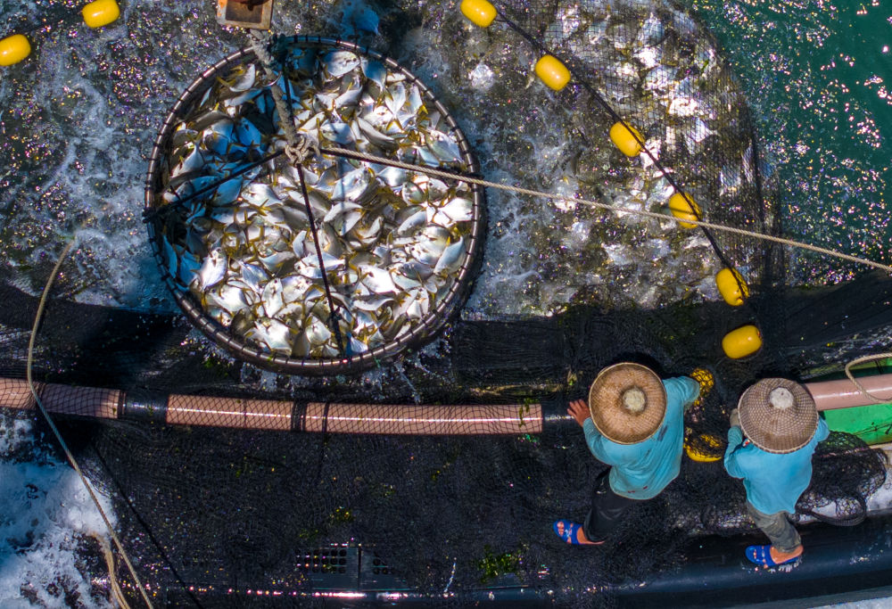 5月27日,在湛江徐聞西連鎮(zhèn),漁業(yè)工人從深海網(wǎng)箱中打撈金鯧魚(無人機(jī)照片)。新華社記者 毛思倩 攝