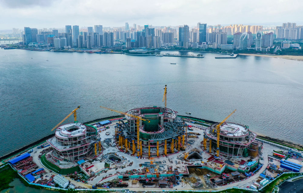 中建深裝承建的湛江市文化中心三館開始安裝幕墻,建成后這里將成為湛江文化新地標(biāo)(5月26日攝,無人機(jī)照片)。新華社記者 劉大偉 攝