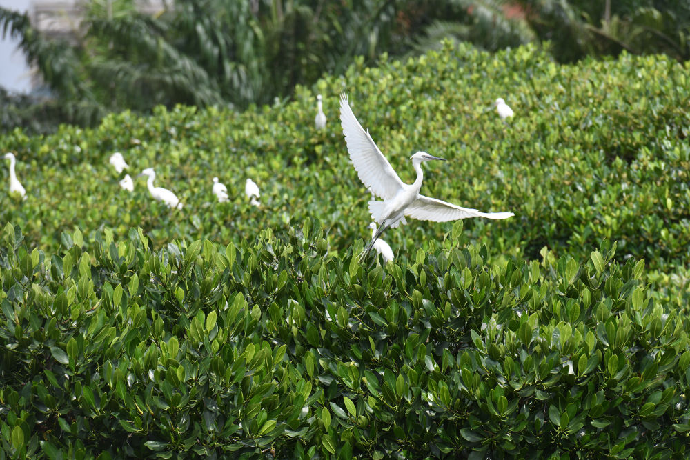 鳥類在湛江市區(qū)海邊的紅樹林棲息(5月25日攝)。新華社記者 梁旭 攝